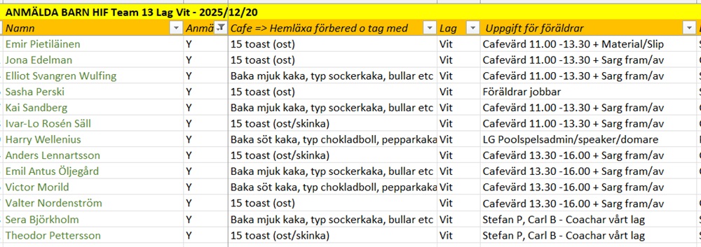 Se bifogad bild med uppdelning av uppgifter som barnens föräldrar ansvarar för på matchdagen, samt även en hemläxa i form av bakning eller förbereda toast. Ber återigen om ursäkt för sent varsel med utskick av uppgifter, hinner man inte baka så går det självklart bra med köpt bakverk.