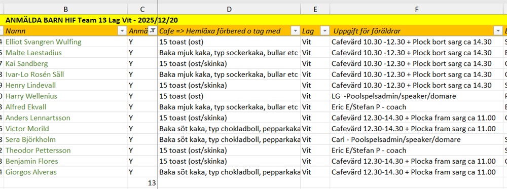 Se bifogad bild med uppdelning av uppgifter som barnens föräldrar ansvarar för på matchdagen, samt även en hemläxa i form av bakning eller förbereda toast. Hinner man inte baka så går det självklart bra med köpt bakverk.