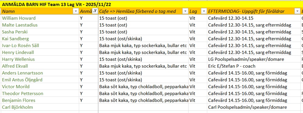 Se bifogad bild med uppdelning av uppgifter som barnens föräldrar ansvarar för på matchdagen, samt även en hemläxa i form av bakning eller förbereda toast. Ber dock om ursäkt för sent varsel, det närmade sig helg snabbare än vad jag insåg. Hinner man inte baka så går det självklart bra med köpt bakverk.